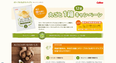 抽選で1グループ様にオリーブオイルポテトチップスを毎月1箱×12ヶ月プレゼントするキャンペーン開催中