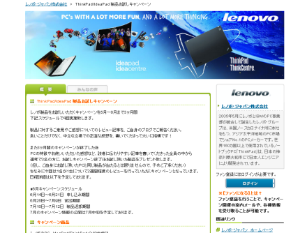 レノボさんが『ThinkPad/IdeaPad 製品お試しキャンペーン』と題して 第2回目のファンサイトを開始しました。