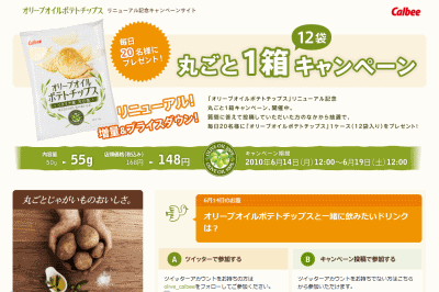 カルビー「オリーブオイルポテトチップス」が本日6/14(月)にリニューアルされます。 リニューアルを記念して、Twitterを活用した、「丸ごと1箱(12袋)キャンペーン」を開催しています。 ■カルビーオリーブオイルポテ […]
