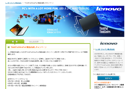 レノボさんが『ThinkPad/IdeaPad 製品お試しキャンペーン』と題して ファンサイトを開始しました。