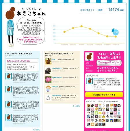 「ローソン つぶやきまとめサイト」は、ローソンクルー「あきこちゃん」(公式Twitterアカウント)のつぶやきを始め「ローソン」や、ローソンが3月から開始したポイントターミナル「ポンタ」に関するつぶやきを集約・表示するサ […]