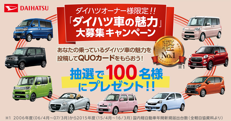 ダイハツの軽自動車の魅力を投稿してQUOカードが当たる「ダイハツ車の魅力」大募集キャンペーン実施中!!