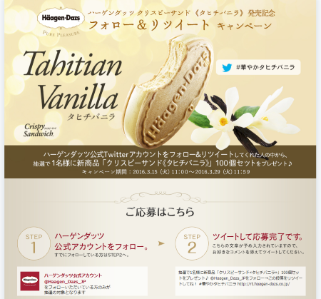 ハーゲンダッツ クリスピーサンド ≪タヒチバニラ≫ 発売記念フォロー&リツイートキャンペーン実施中!