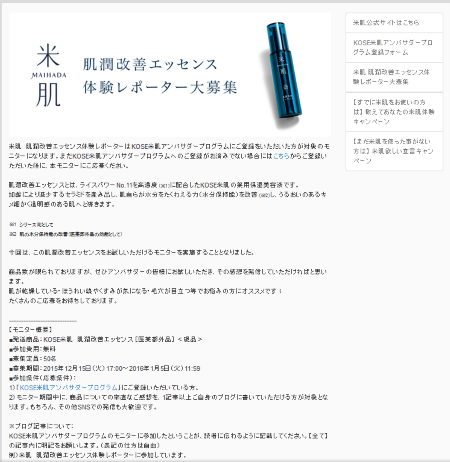 KOSE米肌アンバサダープログラム開始と同時に米肌モニターと各キャンペーンも開始いたします。 「米肌 肌潤改善エッセンス体験レポーター」募集開始! 肌潤改善エッセンスとは、ライスパワーNo.11を高濃度(※1)に配合した […]