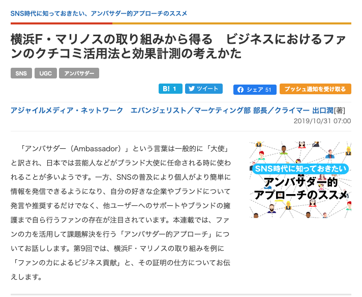 月に一度の連載が公開されました。 【横浜F・マリノスの取り組みから得る ビジネスにおけるファンのクチコミ活用法と効果計測の考えかた】 ぜひご覧ください。