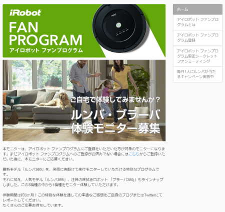 「第1回アイロボット ファンプログラム体験モニター」参加者募集中!