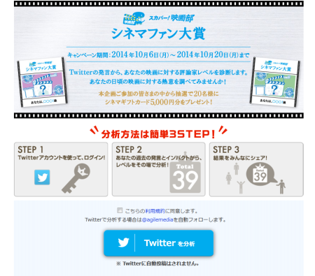 この度、スカパー!映画部シネマファン大賞を開催いたします! 日本全国の映画好きの皆さま、 日頃の映画に対する熱意を調べてみませんか? Twitterでの発言から、あなたの映画への評論家レベルを診断します。 ■□■□■□■ […]