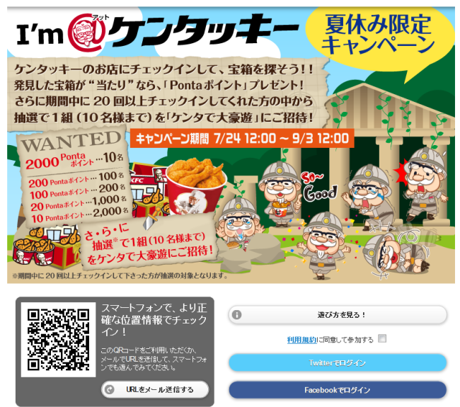 「I’m @ ケンタッキー」夏休み限定キャンペーンがスタートしました! ケンタッキーのお店にチェックインして発見した宝箱が“当たり”なら、「Pontaポイント」プレゼント! さらに期間中に20回以上チェックインしてくれた […]