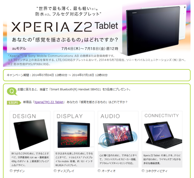 新製品「Xperia(TM) Z2 Tablet」をテーマにした 投稿キャンペーンが始まりました。 新製品「Xperia(TM) Z2 Tablet」あなたの「感覚を揺さぶるもの」はどれですか? あなたの興味があるポイン […]