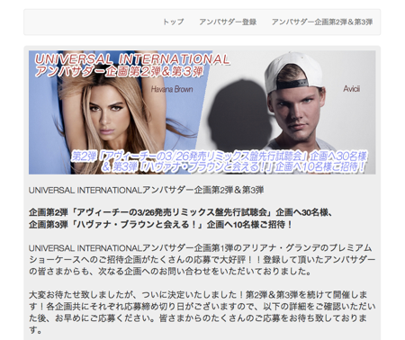 「UNIVERSAL INTERNATIONAL アンバサダー」の第2弾「アヴィーチーの3/26発売リミックス盤先行試聴会」企画、第3弾「ハヴァナ・ブラウンと会える!」企画の募集が開始しました! ご興味のある方は是非ご応 […]