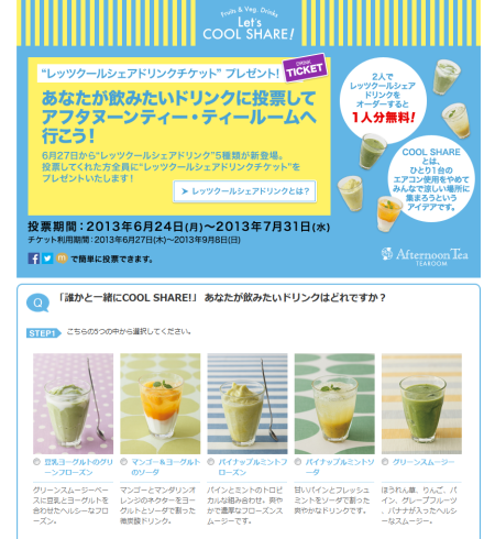あなたが飲みたいドリンクに投票してアフタヌーンティー・ティールームへ行こう! 6月27日から“レッツクールシェアドリンク”5種類が新登場。 投票してくれた方全員に“レッツクールシェアドリンクチケット”を プレゼントいたし […]