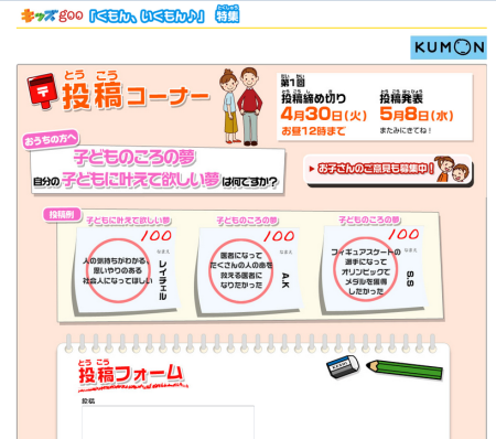 キッズgoo「くもん、いくもん」特集にて 「子どものころの夢、自分の子どもにかなえてほしい夢」投稿キャンペーンがスタートしました! 【キャンペーン内容】 ■キッズgoo「くもん、いくもん」特集 投稿は、こちらから! (お […]