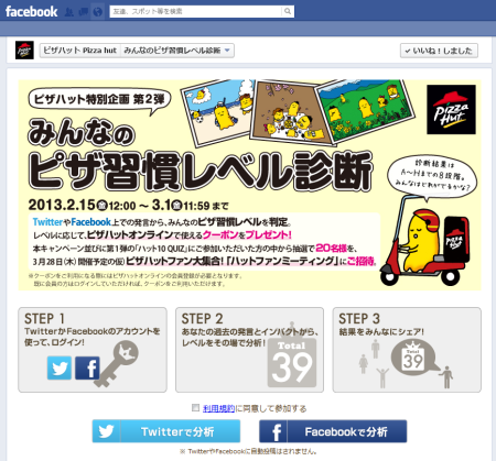 TwitterやFacebook上での発言から、みんなのピザ習慣レベルを診断。 レベルに応じて、ピザハットオンラインで使えるクーポンをプレゼント! ※クーポンをご利用になる際にはピザハットオンラインの会員登録が必要となり […]