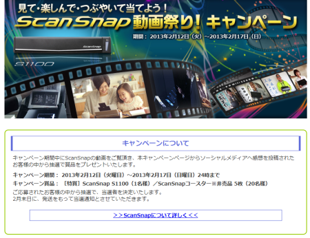 キャンペーン期間中に7本あるScanSnapの動画の中から1本選んでご覧頂き、 本キャンペーンページからソーシャルメディアへ感想を投稿された お客様の中から抽選で豪華な賞品をプレゼントいたします。 一人で複数の動画を見て […]