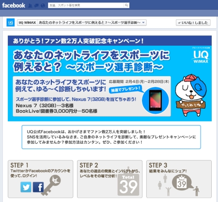UQ WiMAXさんのFacebookページの「いいね!」が2万人を突破しました!! 2万人突破記念としてあなたのネットライフをスポーツ選手タイプに例えるとどの様なタイプになるか診断できるキャンペーンを実施します。 この […]