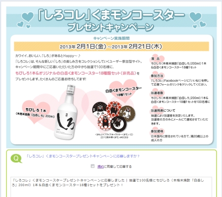 カワイイ、おいしい、「しろ」があるとHappy~♪ 「しろコレ」は、そんな新しい「しろ」の楽しみ方をコレクションしていくユーザー参加型サイト。 キャンペーン期間中にご応募いただいた方の中から抽選で100名様に、 ちびしろ […]