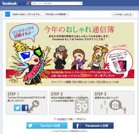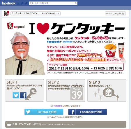あなたの日頃の発言から、ケンタッキー ファンレベルを測定します。 FacebookやTwitterのアカウントで分析してみてください。 キャンペーンにご参加いただいた方、全員にお得なクーポンをプレゼント! さらに、抽選で […]
