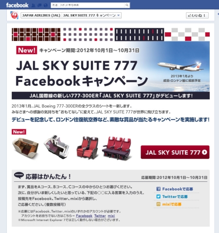 ロンドン往復航空券が当たる!JAL SKY SUITE 777 Facebookキャンペーンスタート!