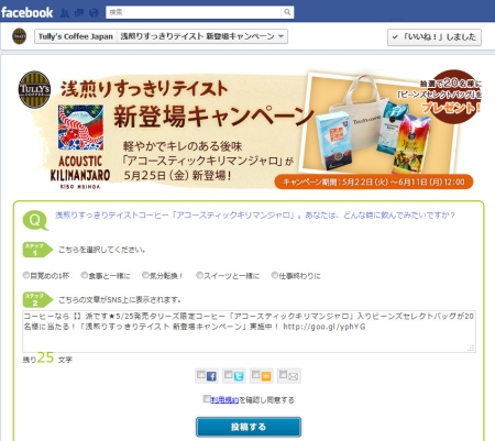 今年で15周年を迎えるタリーズさんのFacebookキャンペーン、『浅煎りすっきりテイスト新登場キャンペーン』がスタートしました。 今回は5月25日(金)から期間限定で発売される、「アコースティックキリマンジャロ」の発売 […]