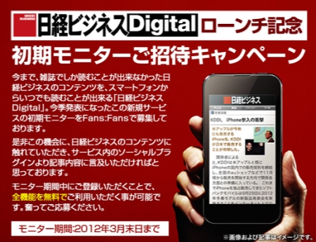 今まで、雑誌でしか読むことが出来なかった日経ビジネスのコンテンツを、スマートフォンからいつでも読むことが出来る「日経ビジネスDigital」。 今季発表になったこの新規サービスの初期モニターをFans:Fansで募集して […]