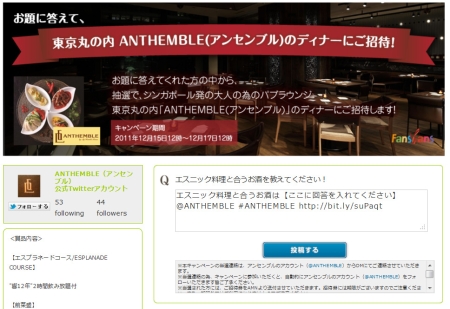 応募期間:2011-12-15 12:00~2011-12-17 12:00 東京・丸の内にあるパブレストラン「ANTHEMBLE(アンセンブル)」のTwitter投稿キャンペーンを開催いたします。