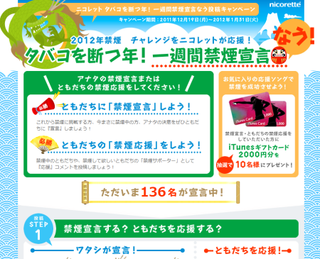 禁煙補助剤で有名なニコレットの、禁煙者とその友人を支援するキャンペーンを開始しました。 ▼タバコを断つ年!一週間禁煙宣言なう http://kinen-sengen.jp/ キャンペーンでは、ご自身の禁煙宣言か、友人知人 […]